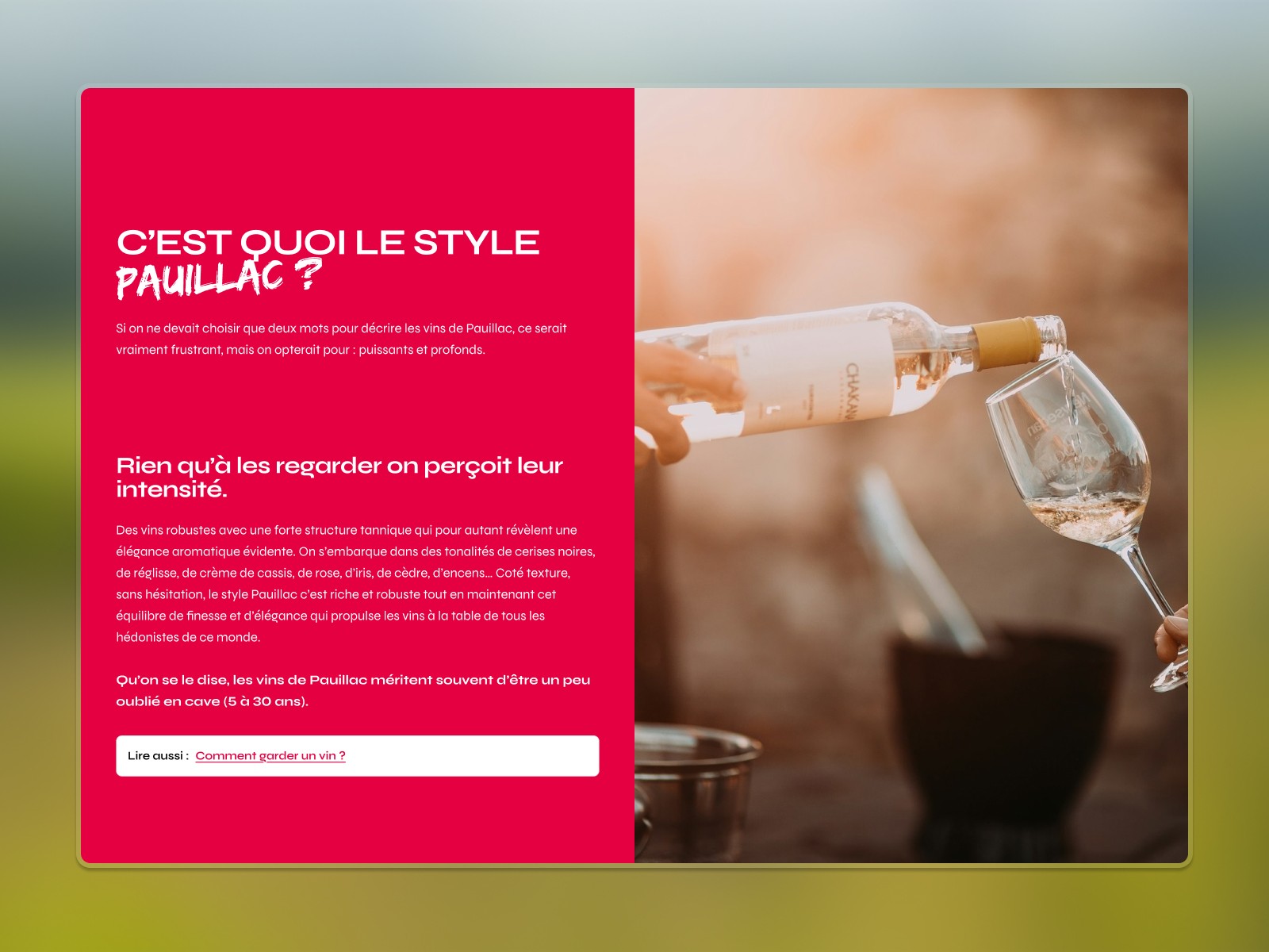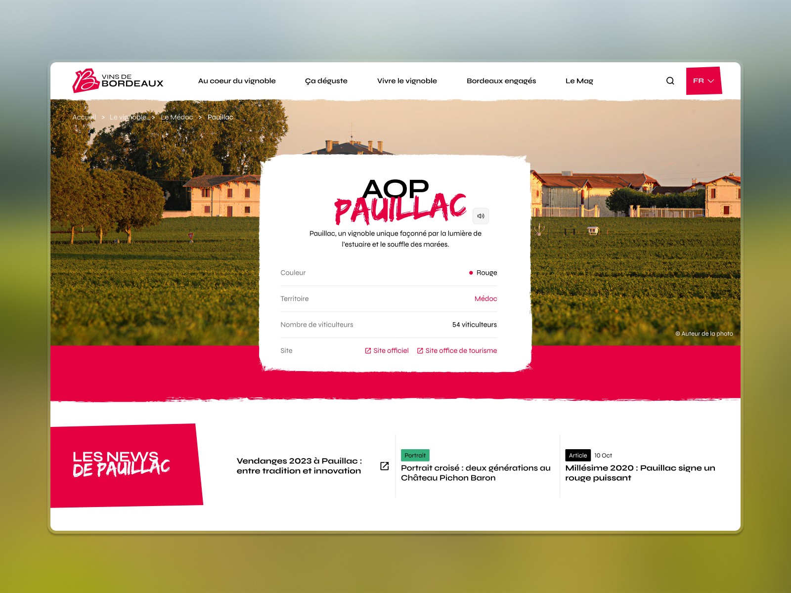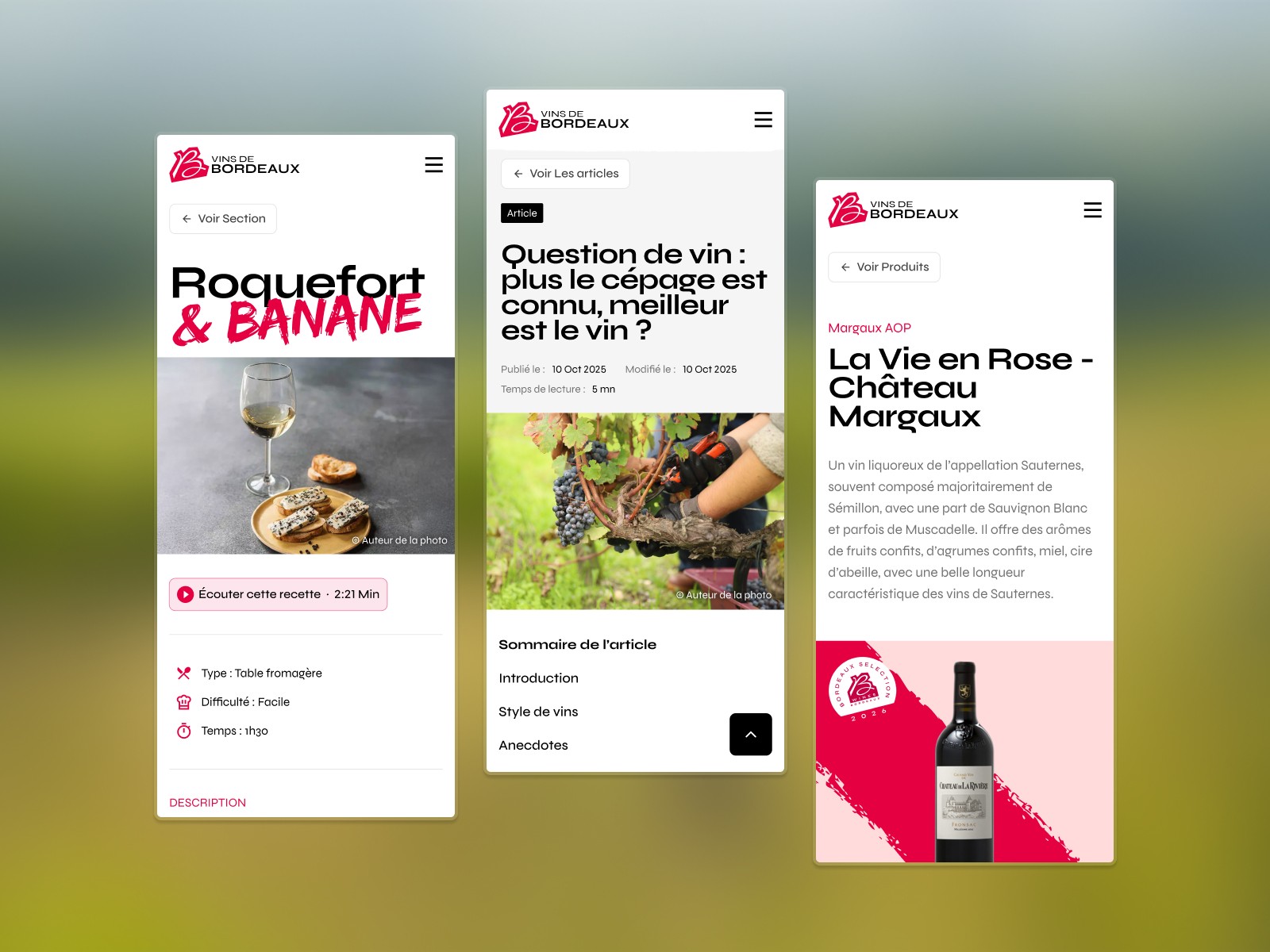 Conception du design system et de l'UI Kit complet pour absorber des typologies de contenu très différentes — blog, fiches lieux, agenda événementiel, contenus œnotouristiques — tout en gardant une cohérence visuelle forte. Chaque composant a été pensé modulaire, pour que la même brique serve aussi bien une recette qu'un événement ou une fiche producteur.