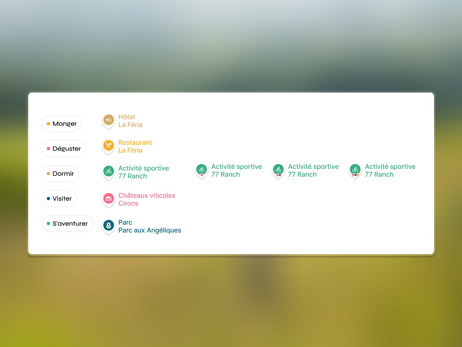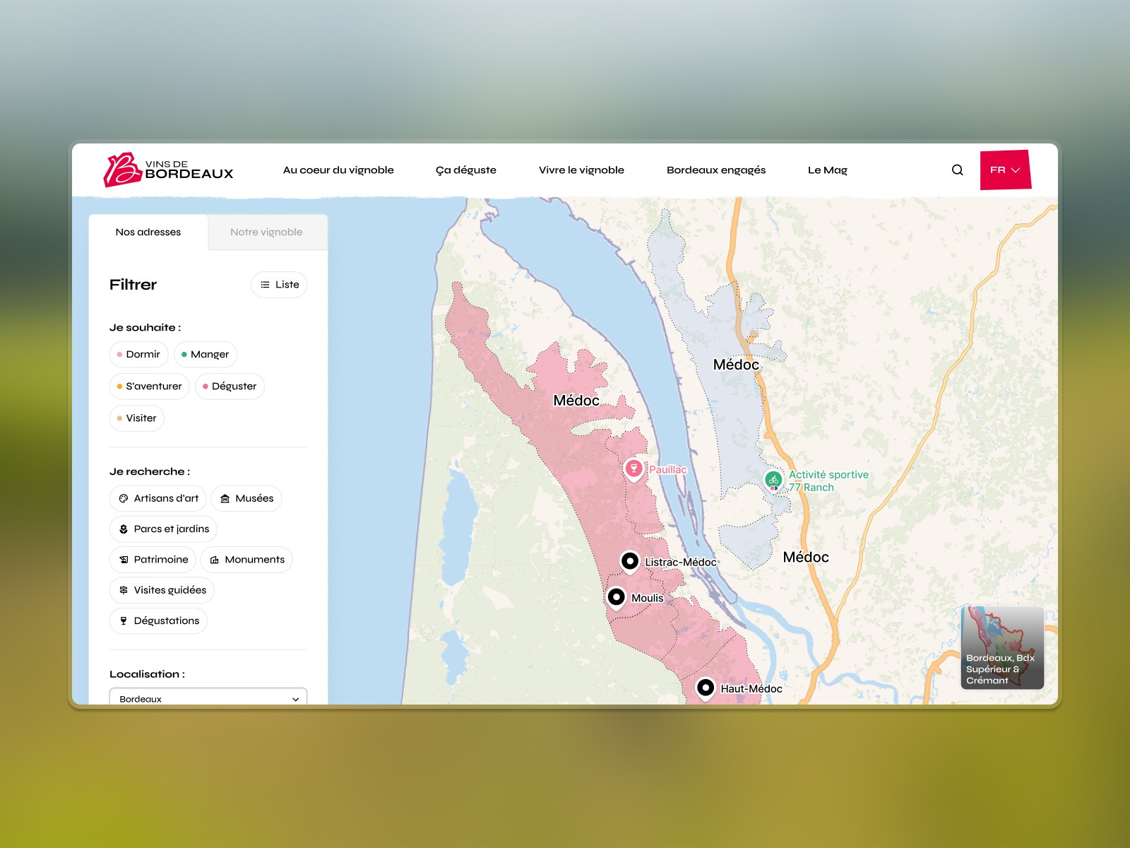 Travail étroit avec le développeur pour concevoir une carte interactive connectée à plusieurs bases de données distinctes (vins, lieux, activités, événements). Les choix design ont été dictés par les contraintes techniques : filtres croisés, hiérarchie de l'information, états de la carte, lisibilité mobile. L'objectif : transformer une complexité back-end en une expérience fluide pour découvrir les vins de Bordeaux et le territoire.